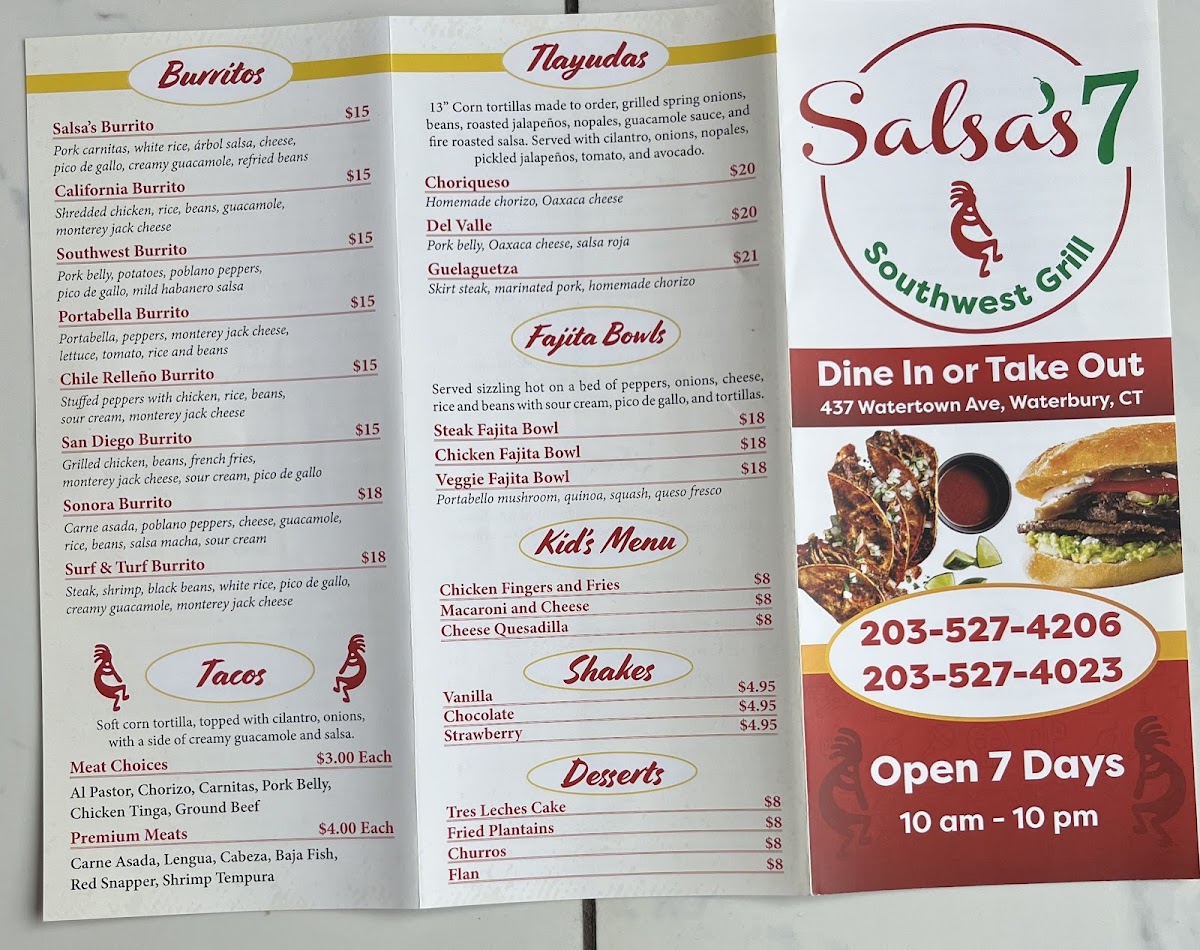 Salsas 7 Southwest Grill in Waterbury, CT, is a vibrant Mexican restaurant that celebrates authentic flavors with a modern twist. Their menu is a flavorful journey through classic and inventive Southwest dishes, centered around fresh, quality ingredients.