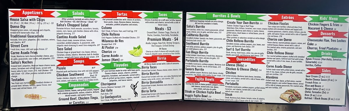 The burritos here, especially the signature Salsa’s Burrito, are a standout—warm tortillas envelop tender pork carnitas, creamy guacamole, melted cheese, and rich refried beans, balanced perfectly by tangy árbol salsa and fresh pico de gallo. The quesadillas also impress, from the savory grilled chicken with Monterey Jack to the earthy Portabello mushroom variety, each served with house-made salsa and sour cream enhancing every bite.